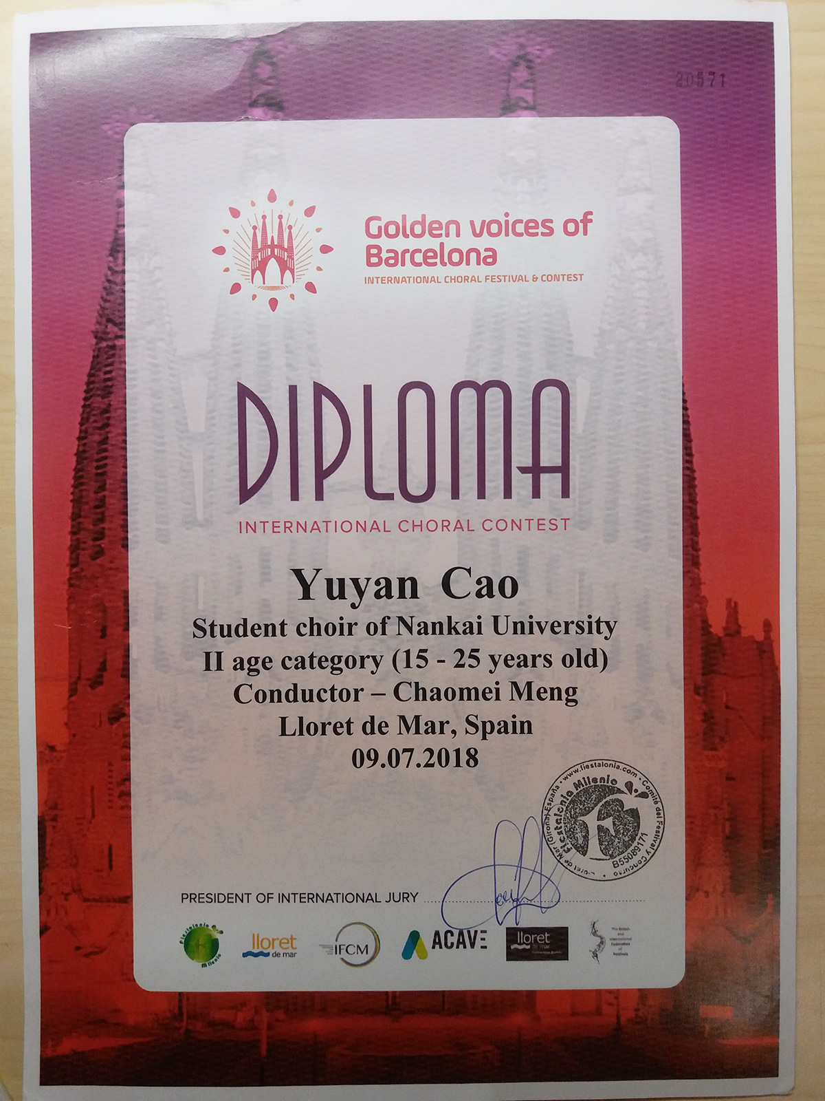 成果类型:求学成果展 成果简介:该证书为曹宇嫣随南开大学学生合唱团征战2018年“巴塞罗那金色之声”国际合唱比赛时获得。在孟超美教授的指导与指挥下,合唱团进行了高强度高难度的排练,付出了极大的心血与精力,最终获得该奖,在世界舞台上唱响南开之声。