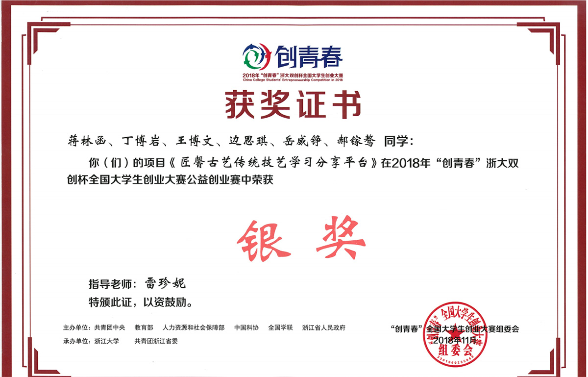 成果类型:求学成果展 成果简介:该证书为丁博岩同学在2018年“创青春”天津市大学生创业大赛中所获荣誉,该生的参赛项目为《匠馨古艺传统技艺学习分享平台》,他在雷珍妮老师的指导下,与团队成员共同努力,获得该奖项。