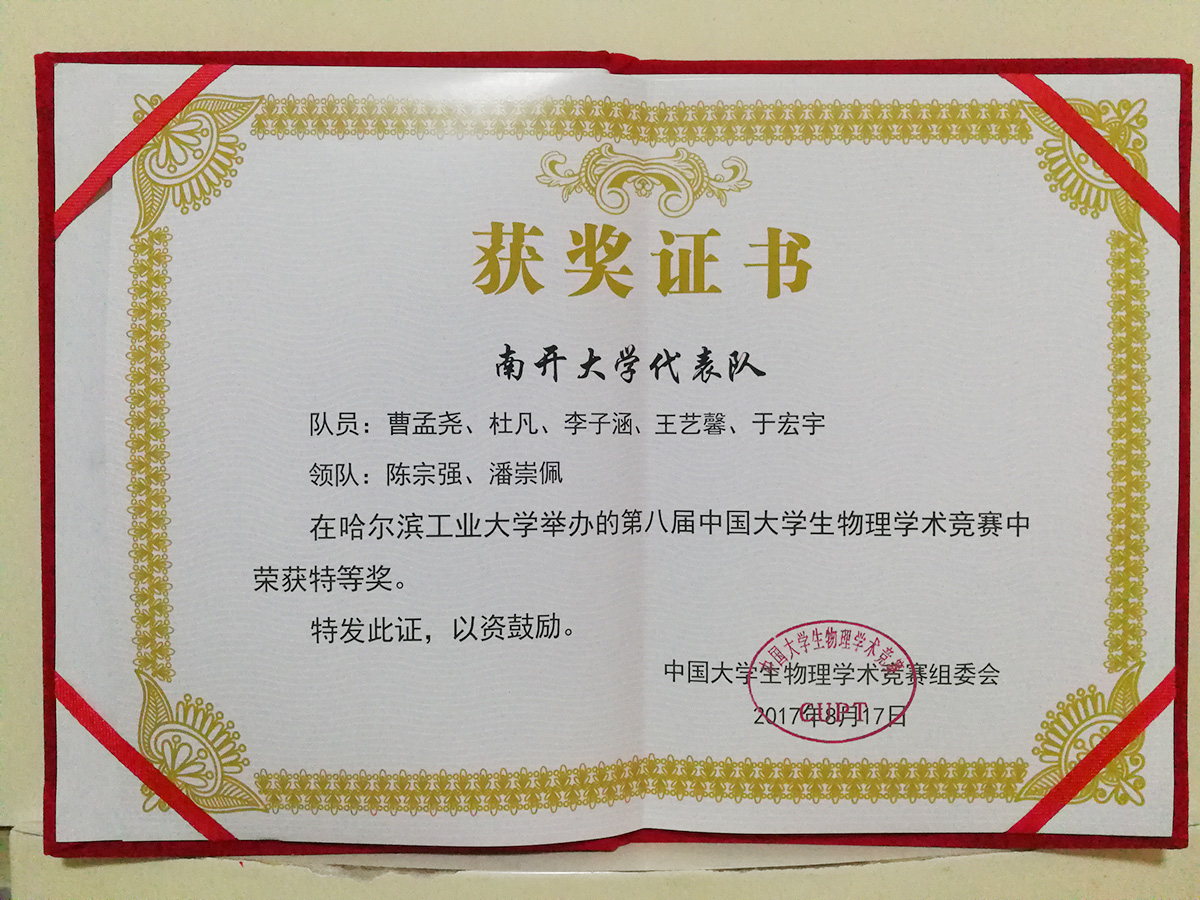 成果类型:求学成果展 成果简介:该证书为曹孟尧、杜凡、李子涵、王艺馨、于宏宇五位同学在CUPT比赛中获得特等奖荣誉,五位同学在准备阶段对于题目进行了深入探究,并在比赛时表现出很好的展现力,获得该奖项。