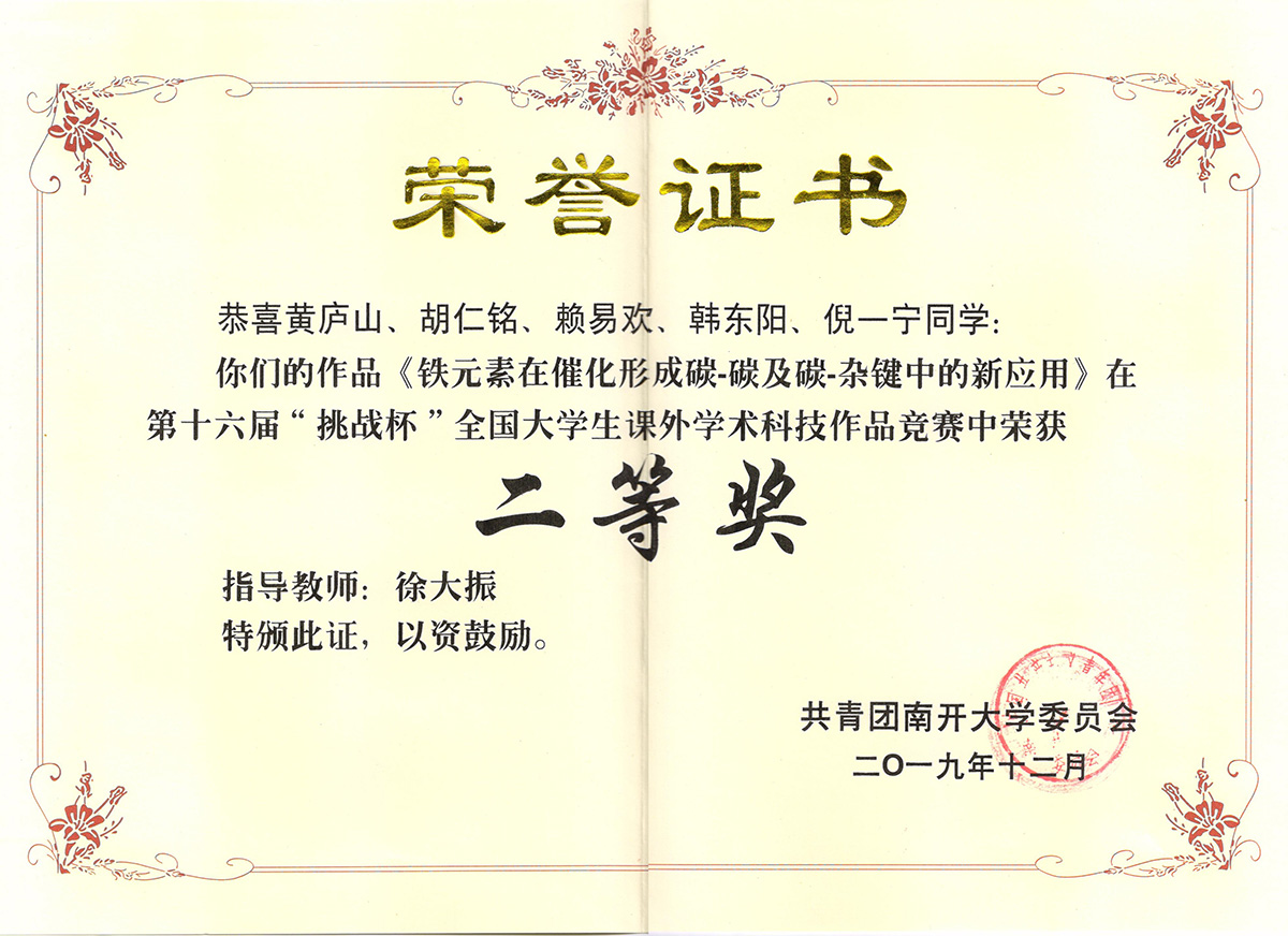成果类型:求学成果展 成果简介:该证书为胡仁铭同学在全国挑战杯比赛中所获荣誉,该生以“铁元素在催化形成碳-碳及碳-杂键中的新应用”为主题参赛,在徐大振老师的指导下,付出一年半的努力,获得该奖项。