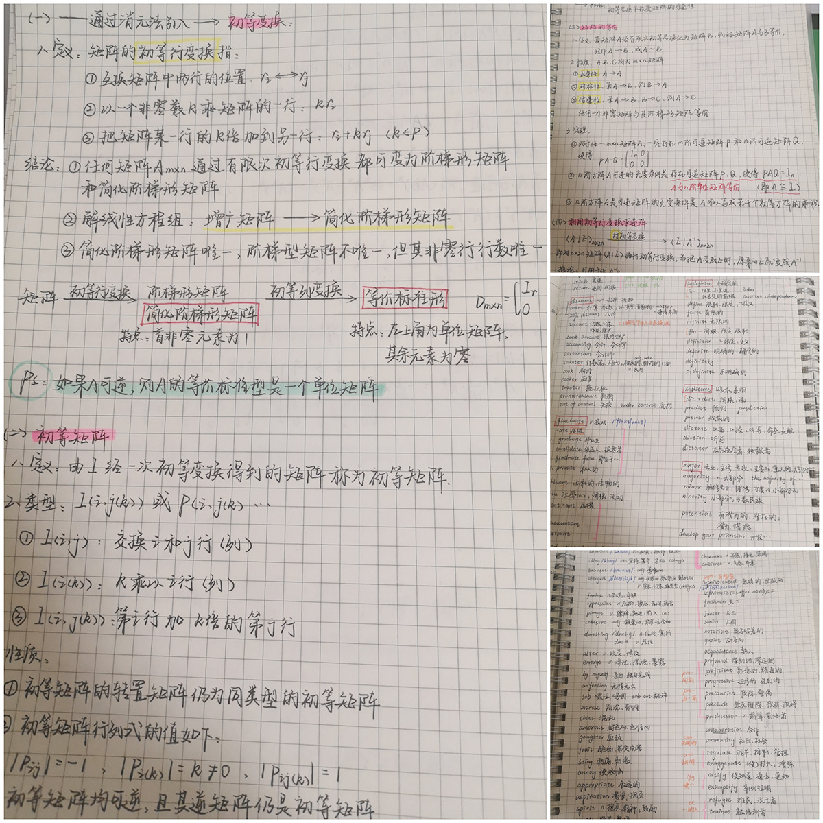 成果类型:居家防疫笔记展 成果简介:坚持做笔记是自初中时就已经养成的习惯,我一直坚信“好记性不如烂笔头”,所以在居家战疫期间,我手中的笔也未曾停下,一笔一划,留在笔记本上的不仅是工工整整的笔记,更是智慧的结晶。因此,每次翻开笔记本,学习的动力也足了几分。在线学习,继续加油!(附图为《线性代数》随堂笔记与英语单词每日背诵记录。)