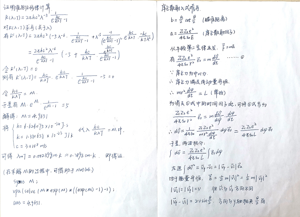 成果类型:居家防疫笔记展 成果简介:本学期,我成为了《原子物理》课程的助教。为了能更好地服务于学生,我通常会将教师布置的作业题会再完整地做一遍。认真对待自己的助教工作,纠正同学们在做题过程中的问题,与大家达到思维的契合,共同进步。