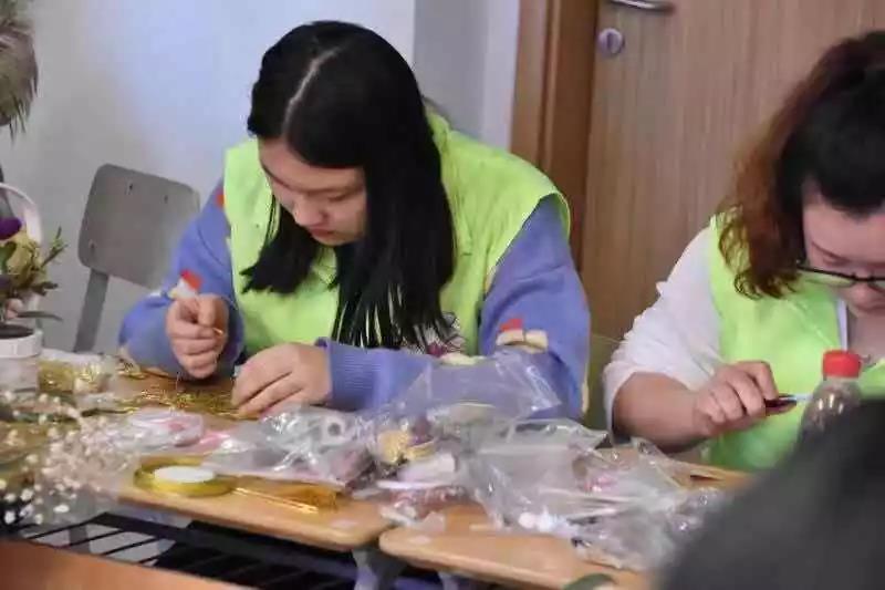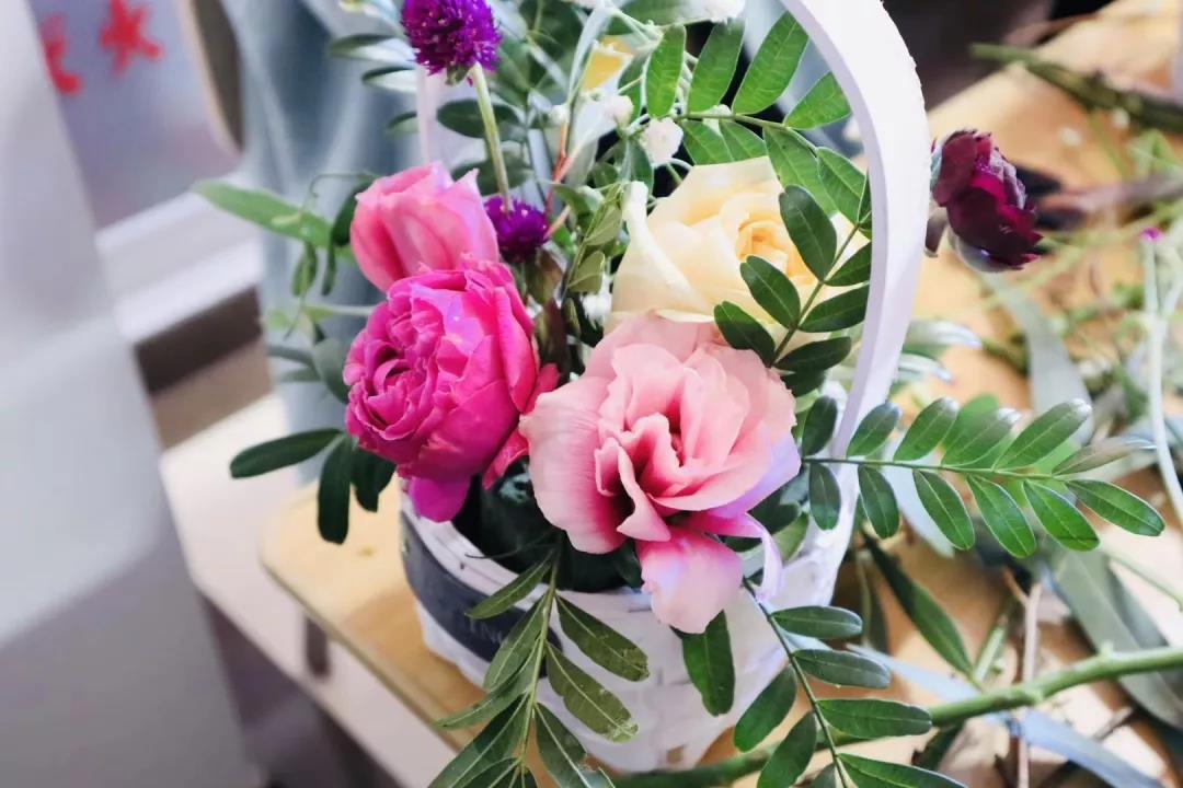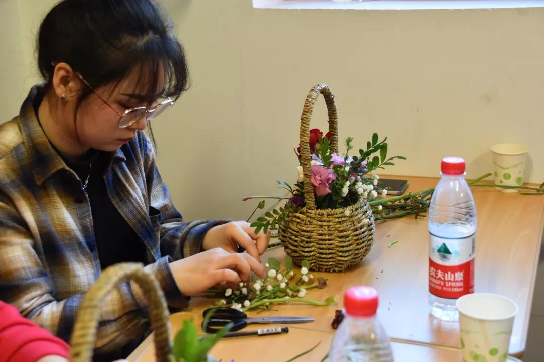 环节一:学习插画,康乃馨、桔梗花、小雏菊、玫瑰、百合……12种花草在佳人的巧手雕琢下各展风姿,或清新淡雅,或高端大气,或色彩绚烂,或新颖创意。同学们在老师的指导下舞动着手中的鲜花,发挥自己的构思与创想,认真地修剪、搭配自己的作品。